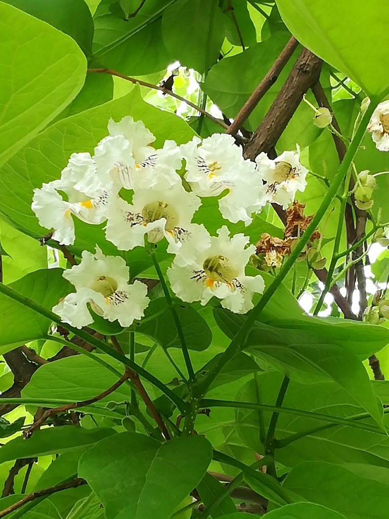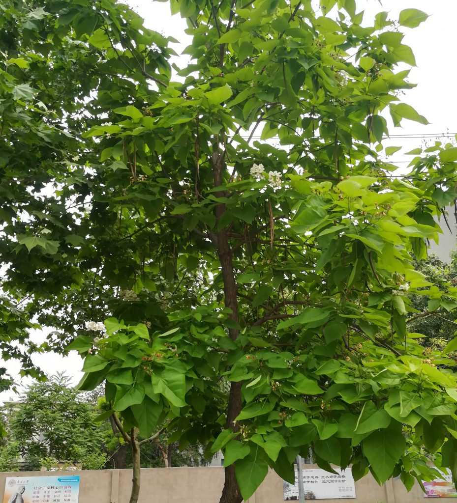 常落叶乔木,树冠伞状。单叶对生,有时轮生,叶卵心形至卵状长圆形,全缘,上面无毛,下面密被短柔毛。圆锥花序顶生,有少数花。花萼2裂,裂片2,舟状,无毛。花冠白色,喉部有2黄色条纹及紫色细斑点,裂片开展。蒴果圆柱形,黑色。种子椭圆形,两端有极细的白色丝状毛。