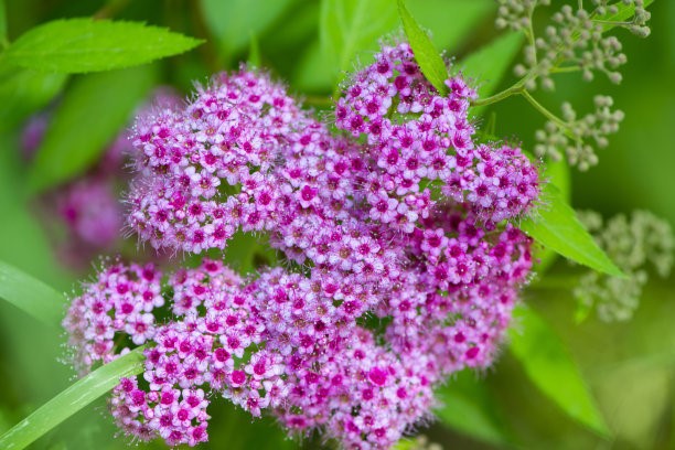 金山绣线菊为落叶小灌木,冬芽小,有鳞片;植株较矮小,高仅25-35cm,枝叶紧密,冠形球状整齐。单叶互生,边缘具尖锐重锯齿。羽状脉 ;具短叶柄,无托叶,新生小叶金黄色,夏叶浅绿色,秋叶金黄色。花两性,伞房花序;花浅粉红色,花萼筒钟状,萼片5;花瓣5,圆形较萼片长;雄蕊长于花瓣,着生在花盘与萼片之间;心皮5,离生。瞢荚果5,沿腹缝线开裂,内具数粒细小种子,种子长圆形,种皮膜质。