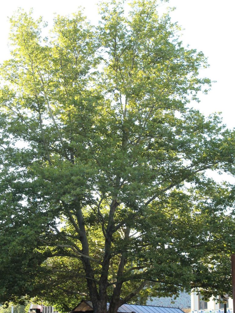 落叶大乔木,树皮光滑,大片块状脱落;嫩枝密生灰黄色绒毛;老枝秃净,红褐色。叶阔卵形,基部截形或微心形,上部掌状5裂,有时7裂或3裂;中央裂片阔三角形,宽度与长度约相等。花通常4数,单性,聚成圆球形头状花序。果枝有头状果序1-2个,稀为3个,常下垂,刺状,坚果之间无突出的绒毛,或有极短的毛。