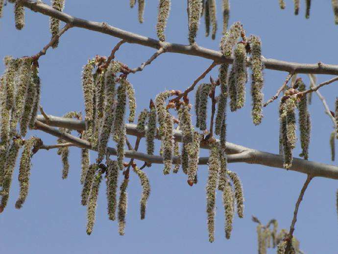 乔木,树皮幼时暗灰色,壮时灰绿色,渐变为灰白色,老时基部黑灰色,纵裂。长枝叶阔卵形或三角状卵形,边缘深齿牙缘或波状齿牙缘,上面暗绿色,光滑,下面密生毡毛,后渐脱落。雄花苞片,密生长毛,雄蕊6-12,花药红色;雌花序苞片褐色,尖裂,柔荑花序,蒴果圆锥形或长卵形,2瓣裂。
