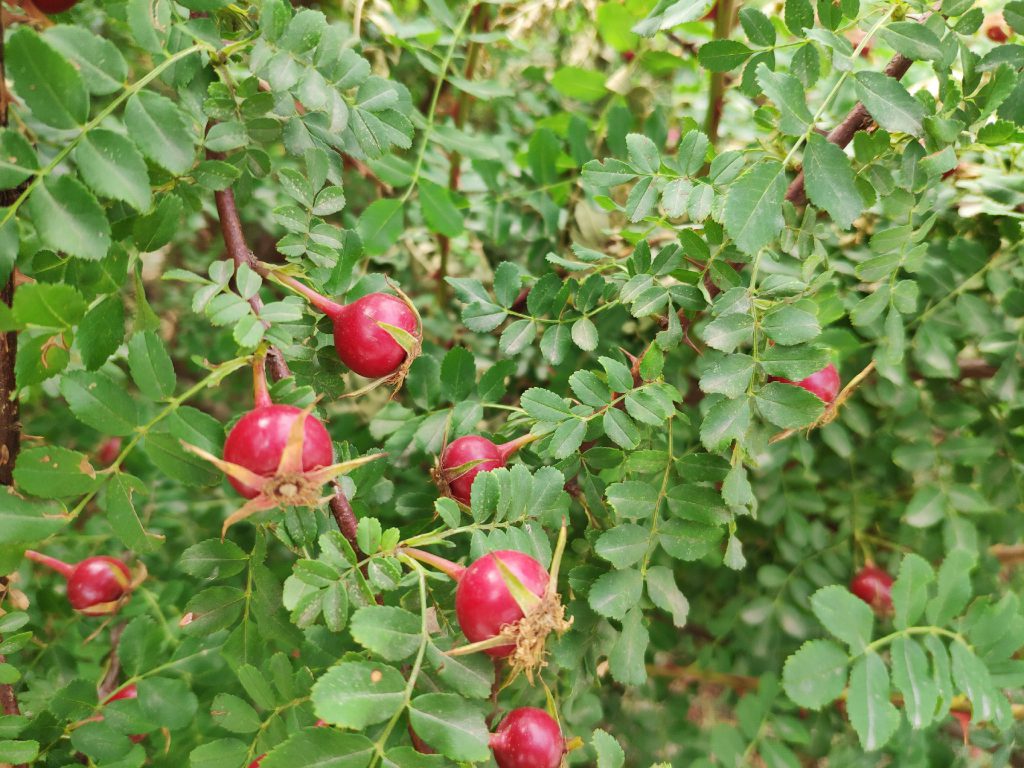 直立灌木,枝粗壮,小枝无毛,有散生皮刺,无针刺。小叶7-13,小叶片宽卵形或近圆形,先端圆钝,基部宽楔形或近圆形,边缘有圆钝锯齿;叶轴、叶柄有稀疏柔毛和小皮刺。花单生于叶腋,重瓣或半重瓣,黄色,无苞片;花瓣黄色,宽倒卵形;花柱离生。果近球形或倒卵圆形,紫褐色。