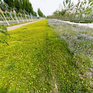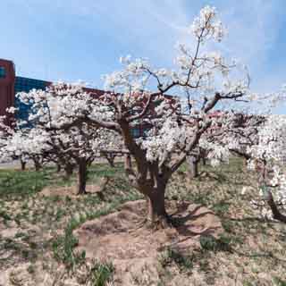 园内植物主要为移自学校杨柳青农场七十年代种植的古梨树,梨树树干虬曲,苍劲有力;生态水溪穿过梨树林,水溪内青莲婷婷,虽花时不同,却也与洁白梨花相互映衬,寓指南开学子要洁白如梨,要出淤泥而不染。